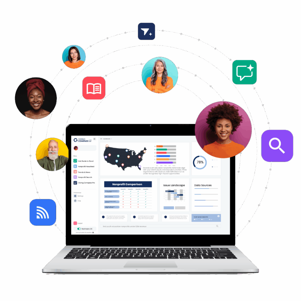 Access the nonprofit information you need, without toggling between databases or searching multiple websites. Giving Compass Pro brings financials, program details, outcomes, and other key data for 1.9 million nonprofits into one connected workspace.